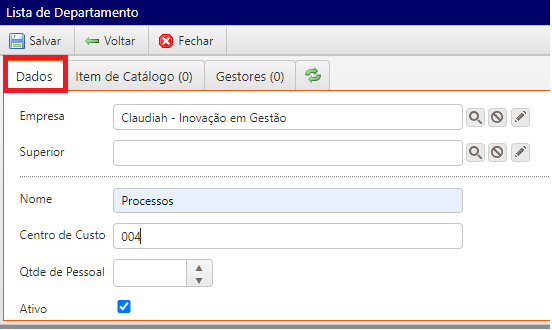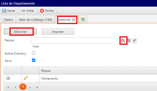 - Na aba gestores adicione os gestores do novo departamento cadastrado e salve as informações: