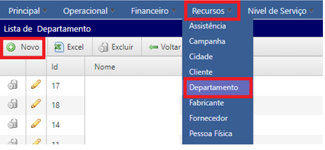 Para cadastrar um novo cliente acesse: Recurso > Departamento > Novo
