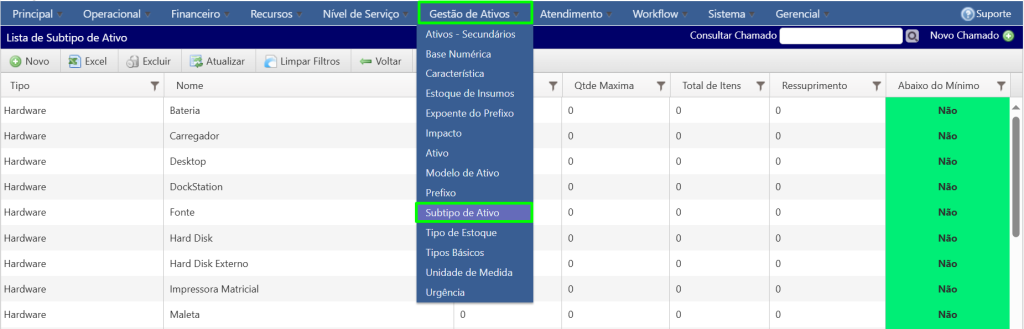 - Acesse o menu (Gestão de Ativos / Subtipo de Ativo)