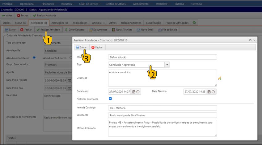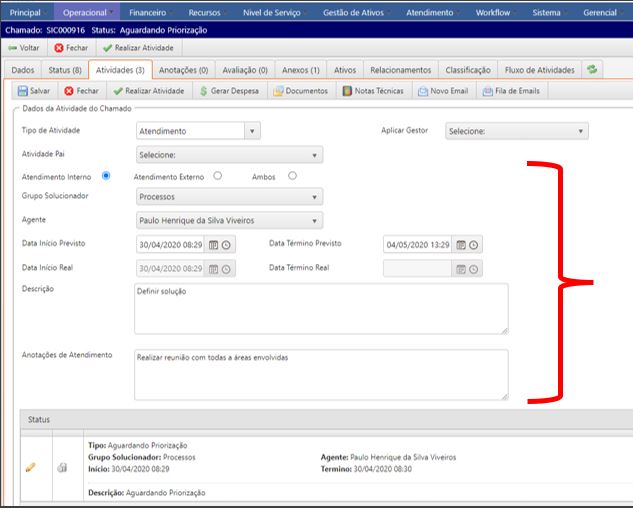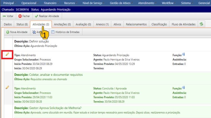 - Para visualizar as atividades do chamado clique na aba “Atividades”