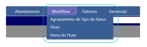 No menu workflow são configurados: o fluxo, os passos do fluxo e o agrupamento do tipo de status.