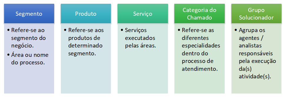 Para configurar o item de catálogo, é necessario cadastrar primeiramente: segmento, produto, serviço, categoria do chamado e grupo solucionador.