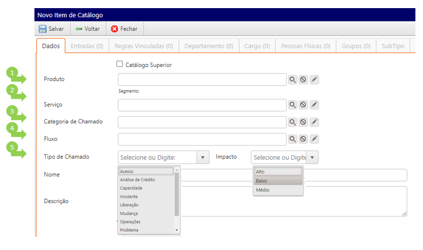 - Escolha o tipo de chamado e o impacto