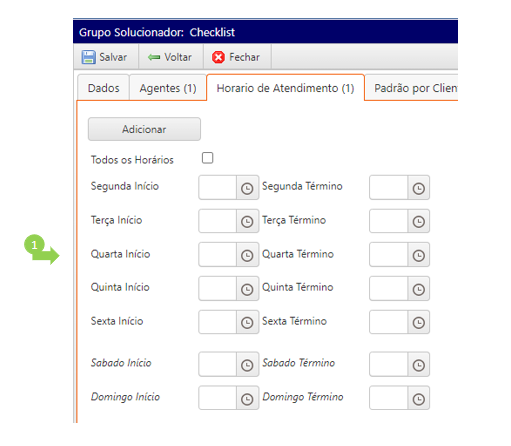 Preencha o horário de início e término em cada dia da semana correspondente
