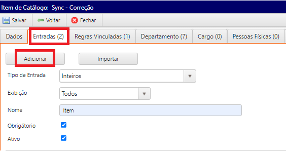 - Obrigatório: opção habilita a obrigatoriedade do preenchimento da entrada