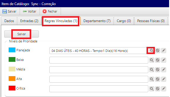 - Na aba “Regra vinculada” é necessário vincular uma regra de atendimento ao novo item de catálogo e salve. Ela define o tempo total de atendimento de acordo com os níveis de prioridade. Deverá ser vinculado pelo menos uma regra de atendimento.
