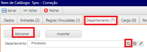 - Na aba “Departamento” serão adicionados os departamentos que terão acesso ao novo item de catálogo. Adicione os departamentos e salve:
