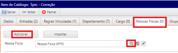 - Na aba “Pessoa Física” adicione a pessoas física que poderão ter acesso ao item de catálogo e salve: