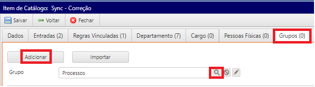 - Na aba “Grupos” adicione os grupos que poderão ter acesso ao novo item de catálogo e salve: