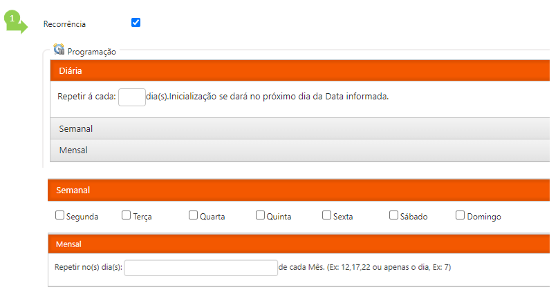 A recorrência pode ser: Diária, Semanal ou Mensal