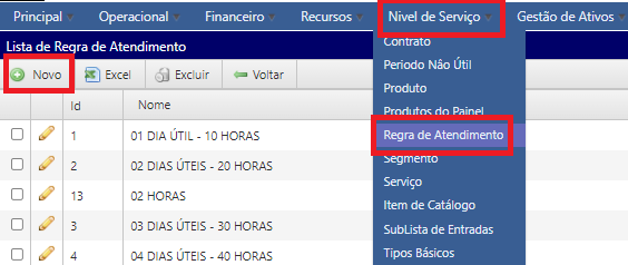 • Para cadastrar uma nova regra de atendimento acesso o menu: Nível de serviço > Regra de atendimento > Novo