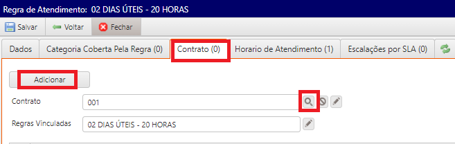 • Na aba contratos casa haja algum contrato a ser vinculado a regra, adicione o contrato e salve: