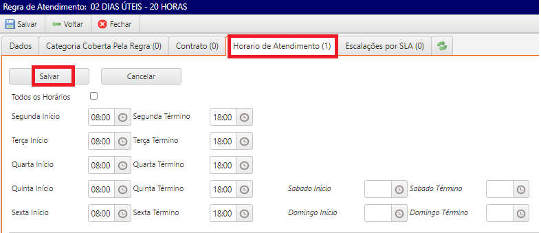 • Na aba horário de atendimento, selecione o período útil que será aplicado na regra e salve: