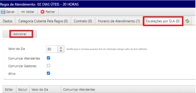 • A configuração de escalações por SLA permite notificar um agente sempre que um chamado vinculado a regra atingir o SLA definido. Para configurar uma escalação adicione as informações e salve: