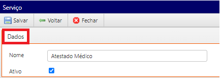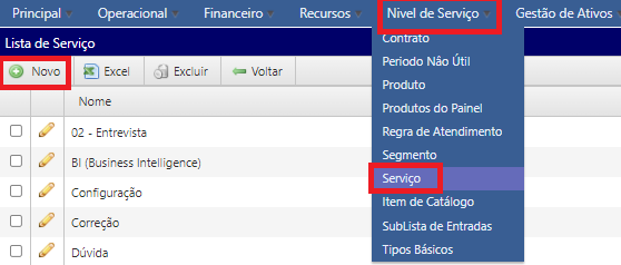 • Para cadastrar um novo serviço acesse o menu: Nível de serviço > Serviço > Novo