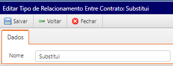 Tipo de relacionamento entre contrato: Adicione o nome do novo tipo de relacionamento e salve: