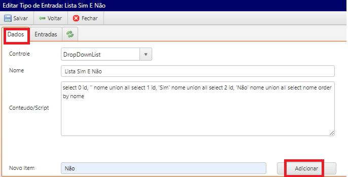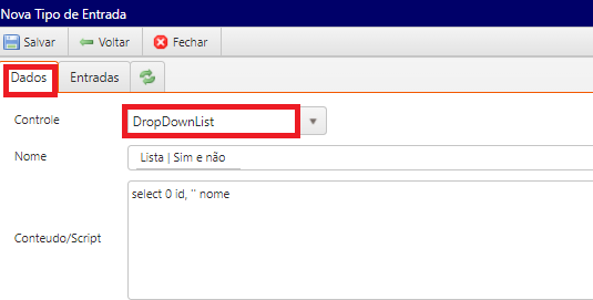 Tipo de entrada: Poderá ser criada diversos tipos de entradas, na aba “dados” adicione as informações e salve:- Controle: Tipo da entrada