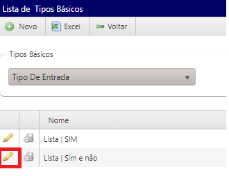 - No caso do tipo lista, localize o novo tipo de entrada criado e selecione a opção editar