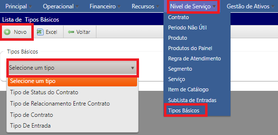 - Para cadastrar um novo tipo básico acesse o menu: Nível de serviço > Tipos básicos > Selecione o tipo > Novo